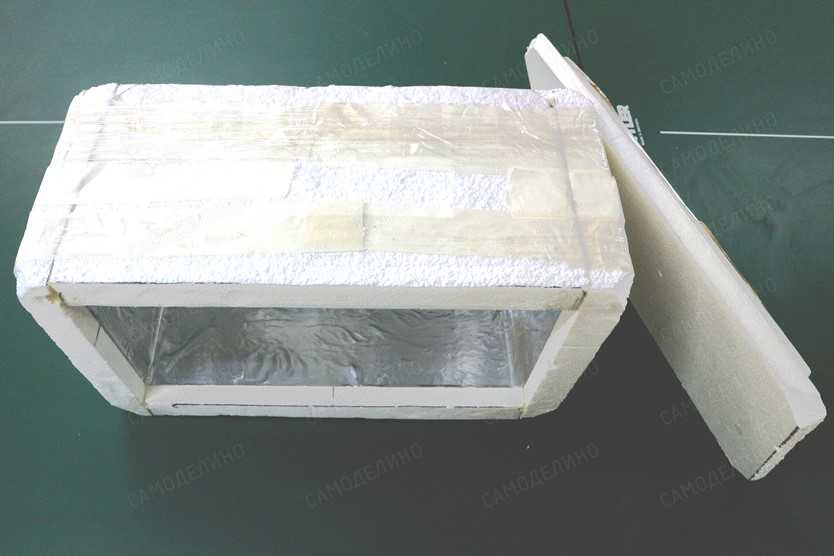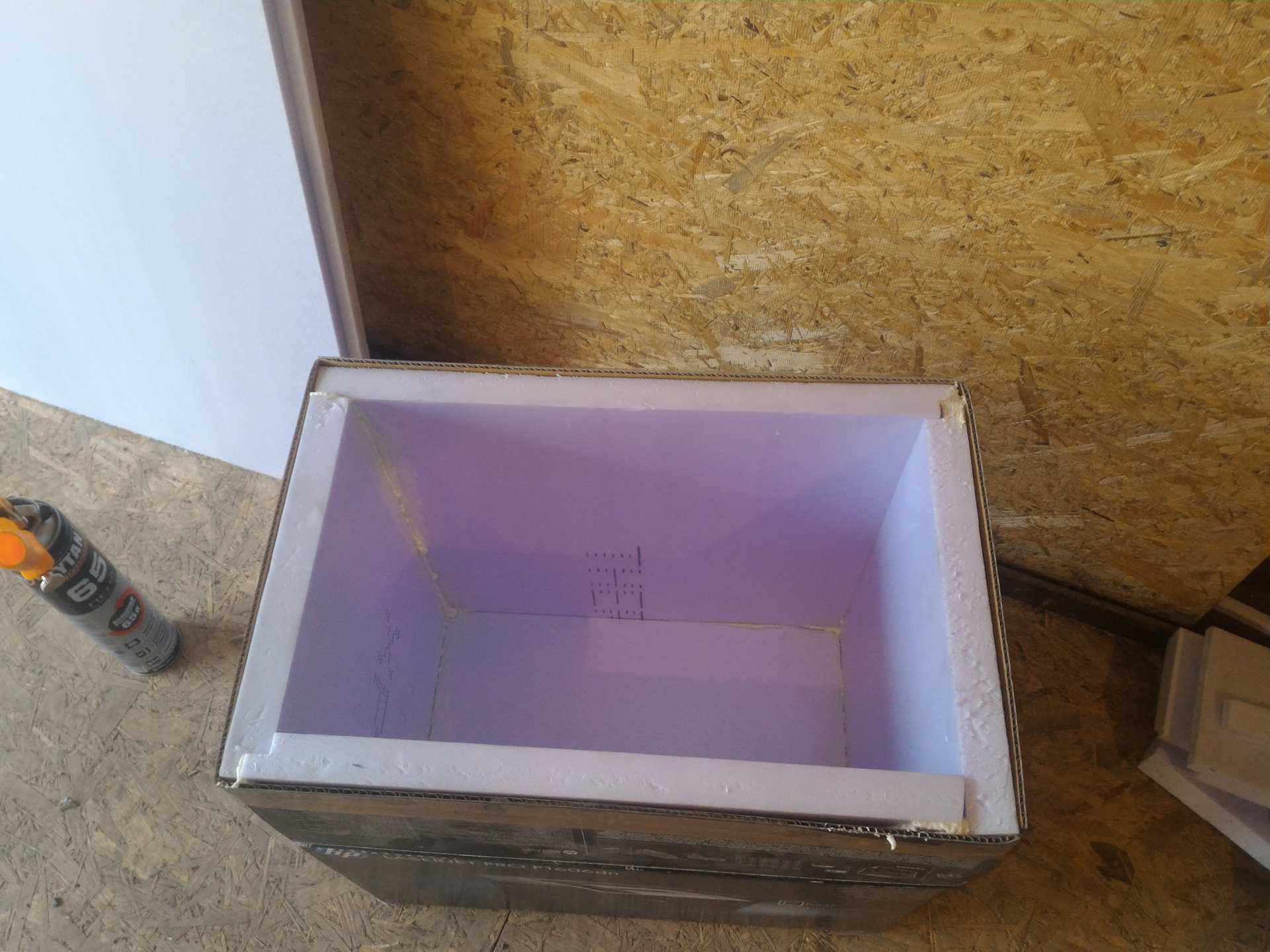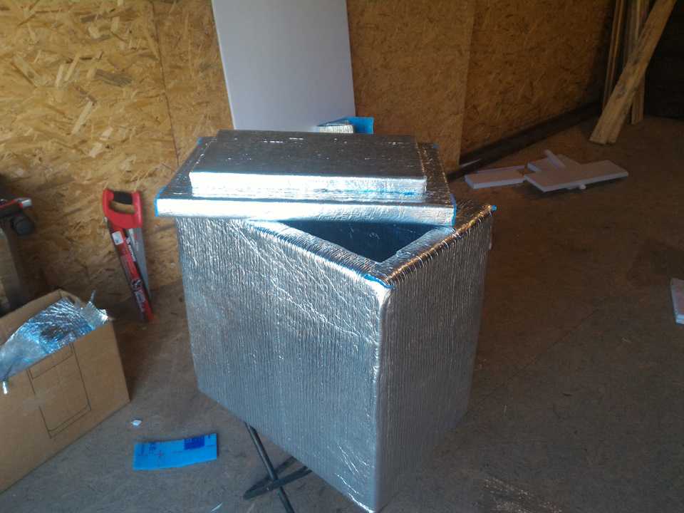 - Теперь ящик и крышку обклеиваем фольгированным пенофолом. Желательно сразу покупать такой, который сам клеится к основе — так вы сэкономите время: