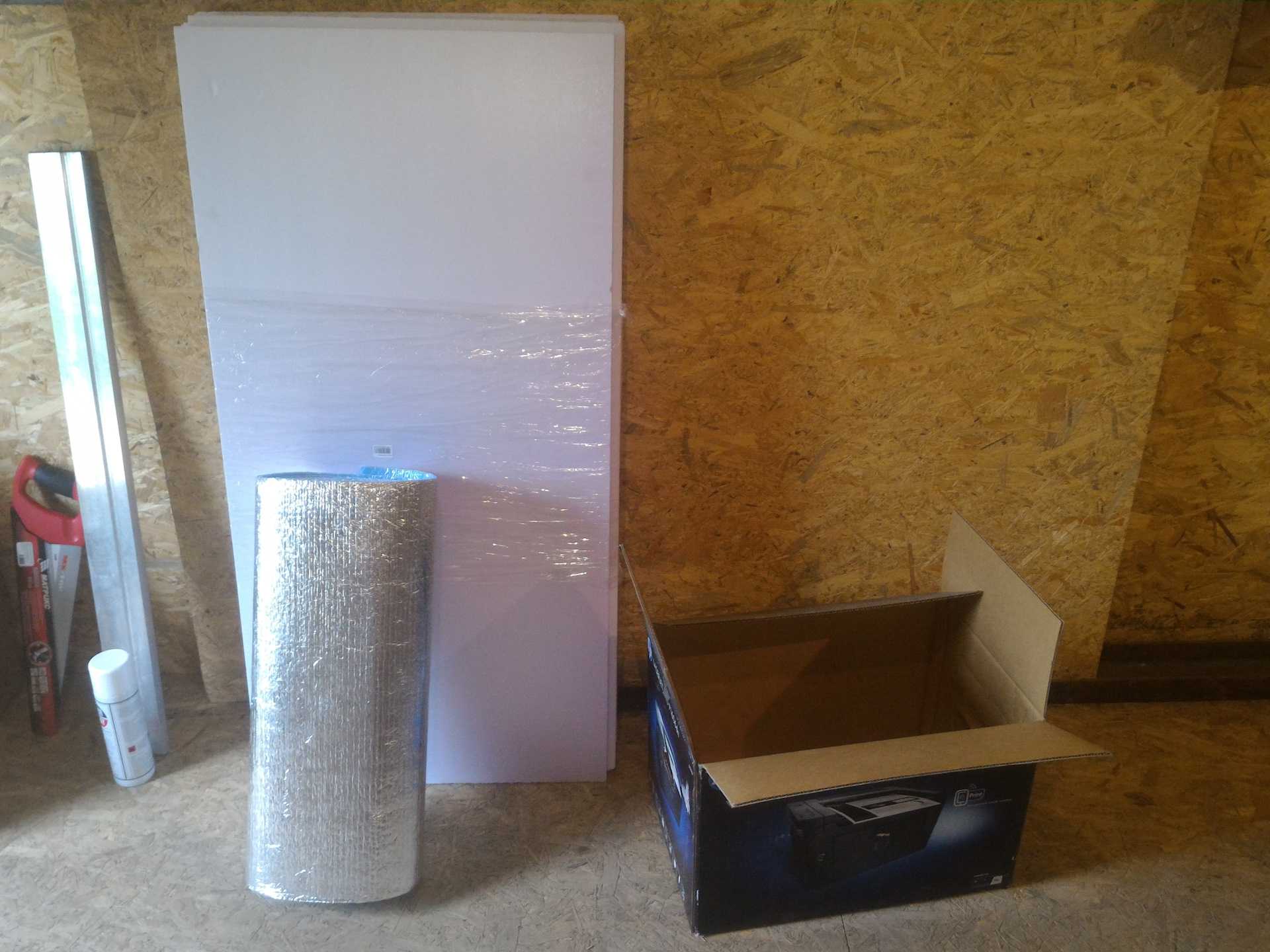 Сначала подготовьте 2 плотных листа пенопласта (размер указывать не будем намеренно, ведь это индивидуальная необходимость), фольгированный пенофол — 5 м, картонную коробку (подойдет от принтера или микроволновой печи), клей и монтажная пена: