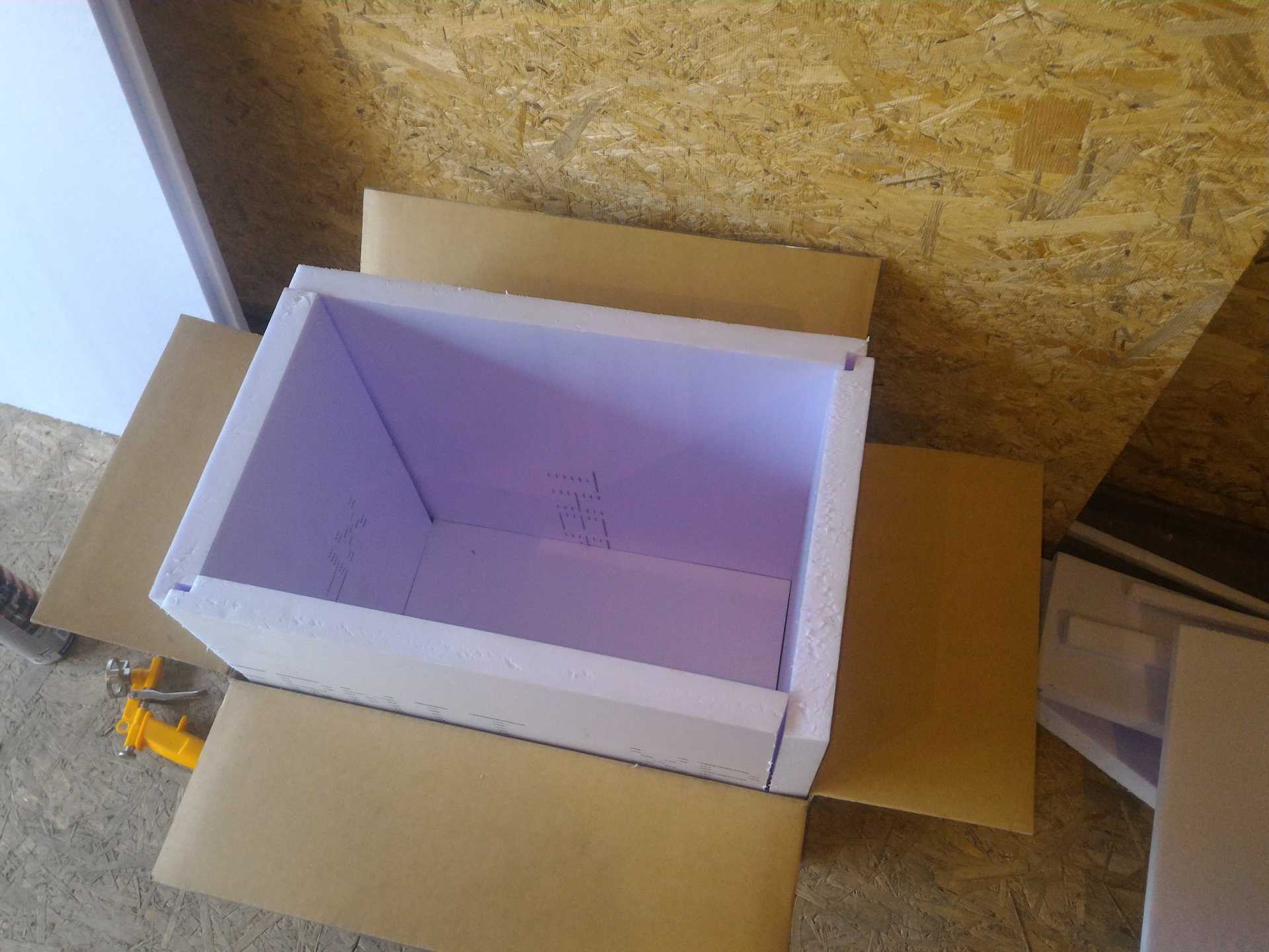 - Устанавливаем короб внутрь сумки и фиксируем его скобами или скотчем. Чтобы улучшить изолирующие качества, перед установкой короба на дно сумки положите лист пенопласта или пеноплекса.