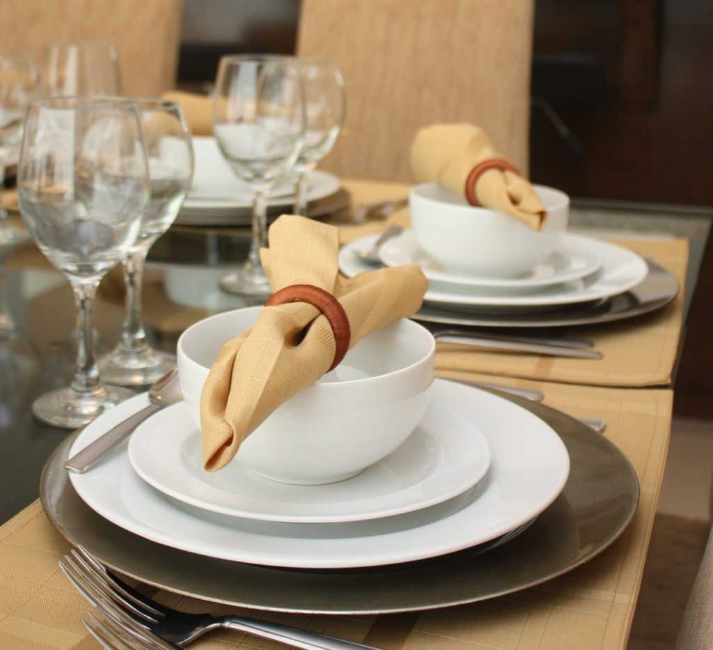 Салфетки. Не нужно отказываться от тканевых салфеток в пользу одноразовых. Они – необъемлемая часть дизайна стола. Если уж совсем не хочется заниматься их стиркой после праздника, тогда стоит присмотреться к бумажным в банкетном стиле. Подложка под столовые приборы определяет место для каждого гостя. Они могут быть не только прямоугольными, но и квадратными (придают современный вид), и круглыми (ломают угловатость стола).