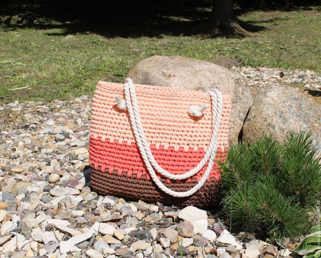 Пляжная сумка из трикотажной пряжи крючком, схема вязания которой представлена ниже, отличается функциональностью и привлекает внимание своим уникальным дизайном. А процесс изготовления не займет много времени