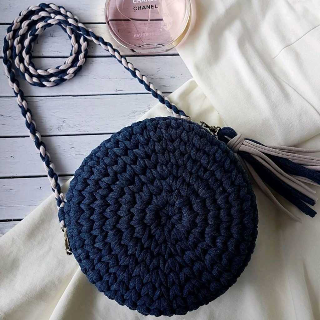 - Смотрится оригинально и легко вяжется круглая сумка крючком из трикотажной пряжи.