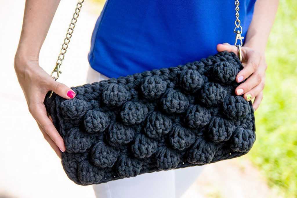 - Очень красиво смотрятся небольшие вязаные сумки-клатчи или Зефирки, которые используют как дополнение к вечерней одежде.