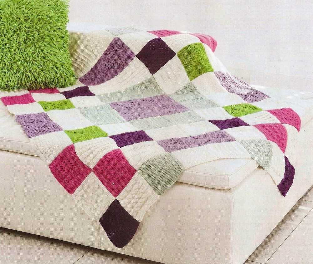 Красивое мелкоквадратное покрывало, вязанное спицами в стиле пэчворк разными оттенками эффектно, смотрится в старинных интерьерах, а также тех, которые пестрят яркими красками. Квадраты должны очень гармонично пересекаться между собой, как по оттенкам, так и по размерам.