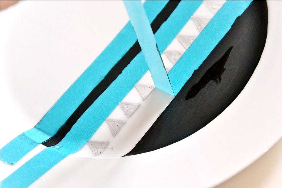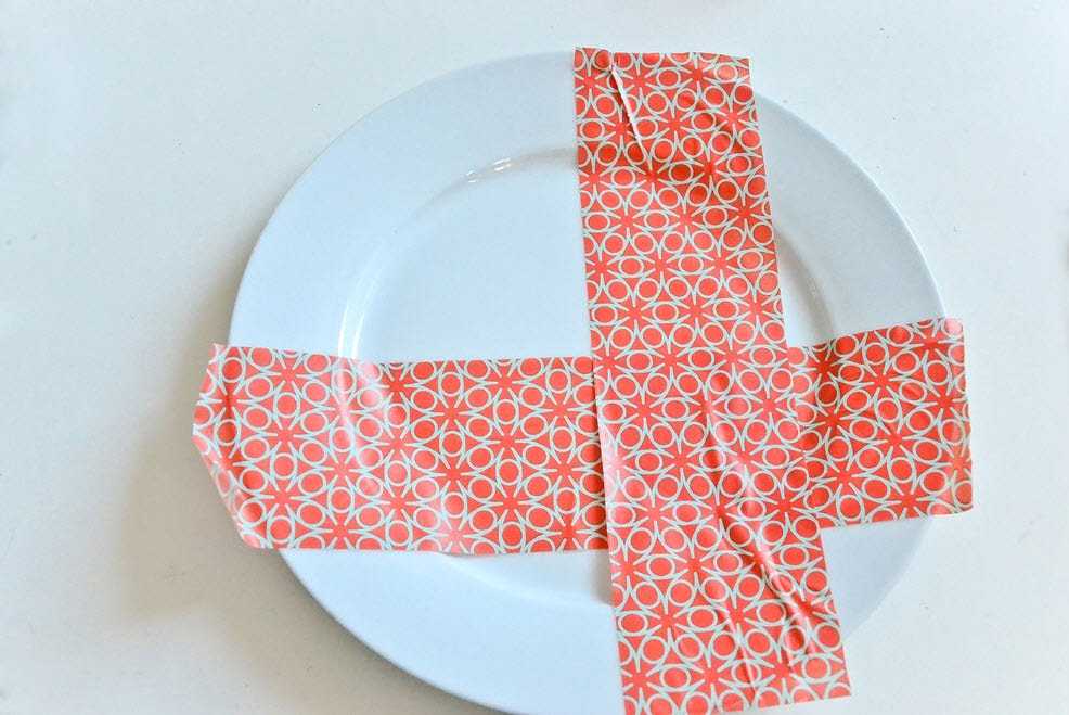 С помощью ленты «нарисуем» на доске полоски, покрасим всю поверхность в нужный нам цвет. Когда ленту уберем, на нашем изделии останется рисунок.