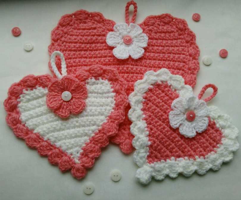Прихватки своими руками в виде сердца вяжутся преимущественно столбиками с накидом и без накида. Оригинальные прихватки получаются на базе 30-34 воздушных петель. Вяжется эта интересная вещь по следующей схеме: