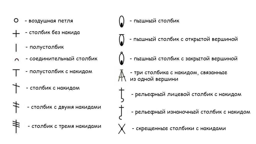 Схемы и узоры сумок крючком невозможно прочитать, не зная условных обозначений. Основные:
