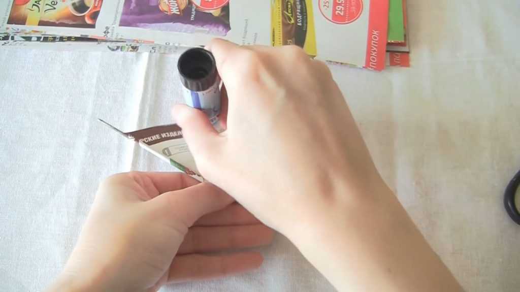 Скрутив трубочку, закрепляем ее небольшим количеством клея, нанеся его на противоположный свободный уголок и плотно прижав его к заготовке