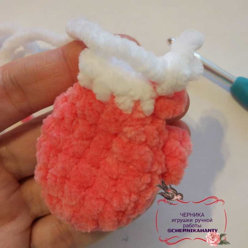 - 8 ряд: * 1 СБН, убавление* (12 п). Наполняем синтепоном одну сторону ботинка, для устойчивости снеговика.