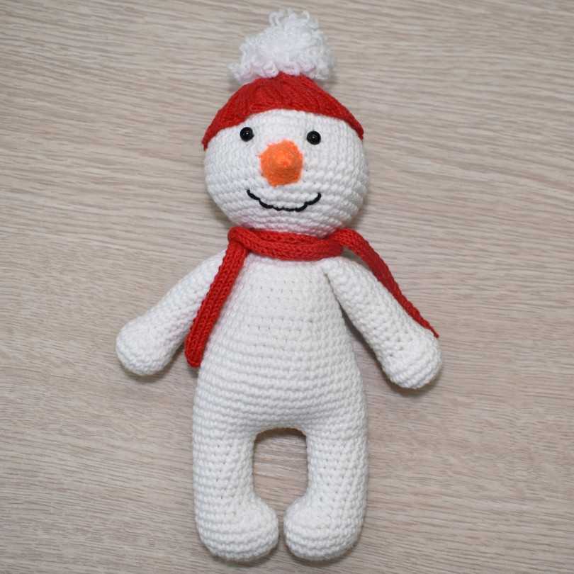 Вязание объемных снеговиков в технике амигуруми сложнее, но и тут можно найти поделку для своего уровня владения крючком. Основными элементами игрушки будут голова и туловище. Голова – это шар белого цвета, а вот туловище может быть как в виде шара большего диаметра, так и повторяющим очертания человеческого тела. Вязать голову и туловище можно по отдельности, а потом сшить вместе или вязать без отрыва. Руки и ноги снеговика могут быть тоже из шариков меньшего диаметра.