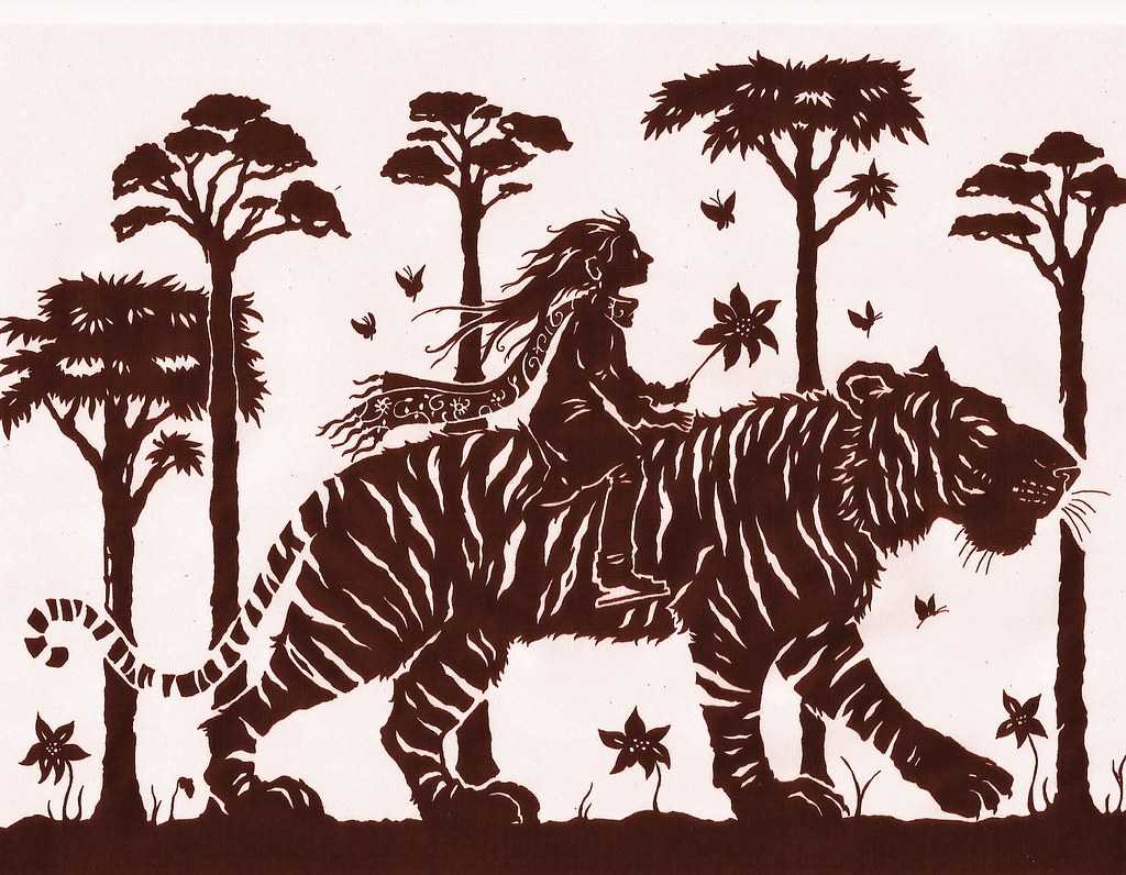 Если есть опыт в работе с вырезалками, то интересно будет попробовать создать не просто изображение символа года, а вырезать целый новогодний или сказочный сюжет. За основу вытынанки возьмите изображение тигра из детской книги или скачайте подходящий рисунок из интернета.