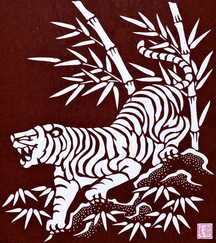 Кстати говоря, технику вытынанки используют не только для украшения окон. Если тигра вырезать не из тонкой бумаги, а из картона, то такое изображение вполне подойдет для оригинальной картины, которую не стыдно подарить кому-нибудь в качестве новогоднего презента.