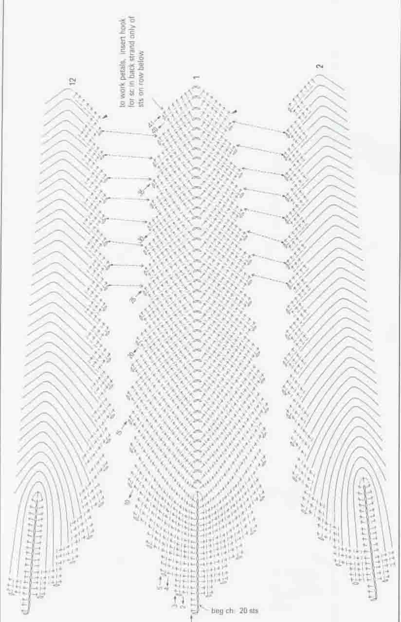 Может возникнуть сложность при вязании лепестков. Они состоят из воздушных петель, в которые в этом же ряду провязаны столбики с накидом. Если приглядеться, на схеме есть стрелочки, указывающие направление вязания. Но достаточно запомнить, в лепестке воздушные петли и столбики с накидом идут в одном ряду, а не в разных.