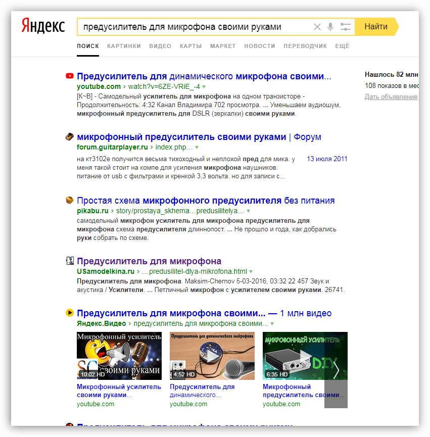 Мы здесь не будем расписывать по шагам, как паять схему (статья не про это), достаточно ввести в поисковик запрос «предусилитель для микрофона своими руками» и получить подробную инструкцию.