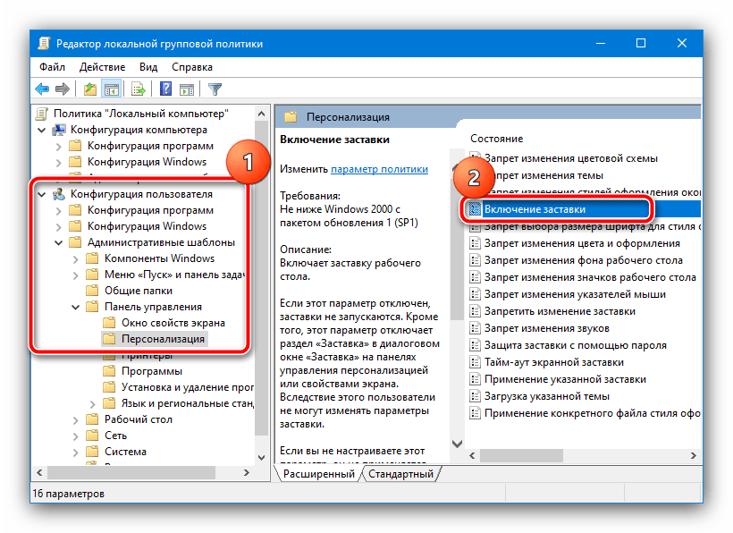 По очереди раскройте каталоги «Конфигурация пользователя» – «Административные шаблоны» – «Панель управления» – «Персонализация» и в списке параметров последнего (правая часть окна) дважды кликните левой кнопкой по пункту «Включение заставки».