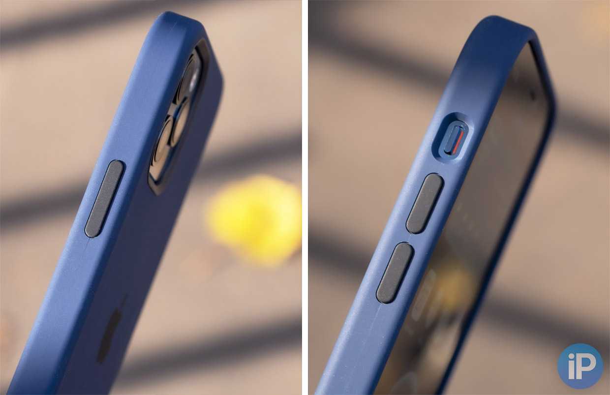 Кнопки на гранях в силиконовом чехле сделаны из такого же материала и покрашены в более тёмные цвета, чем корпус. На синей модели они вообще почти чёрные. Нажимаются очень легко, без усилий и почти не выступают, поэтому случайно не срабатывают в кармане.