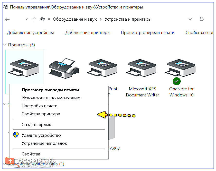 Для ее запуска — нужно открыть панель управления Windows и перейти в раздел “Оборудование и звукУстройства и принтеры” . Далее следует открыть свойства проблемного принтера.