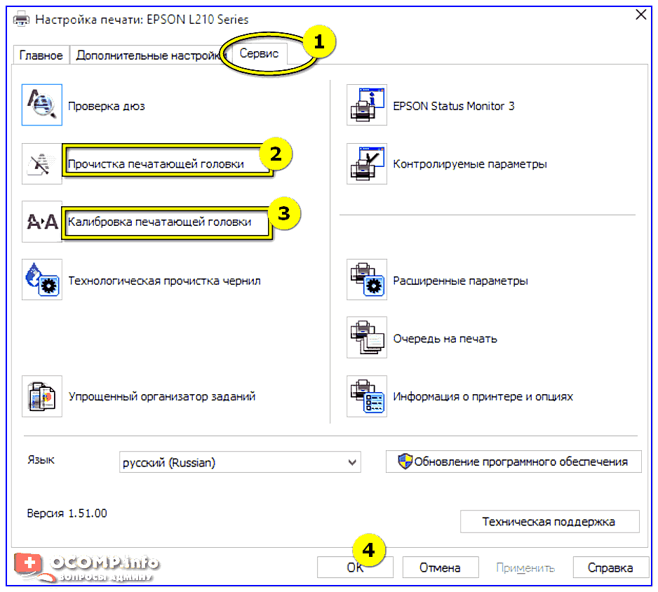 В свойствах многое зависит от модели принтера и его драйвера. В большинстве случаев достаточно открыть вкладку “Сервис” (“Обслуживание”) и выбрать пункт “Прочистка печатающей головки” . Далее принтер немного “прожужжит” и качество печати станет заметно лучше.